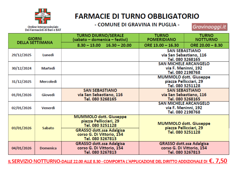 Farmacia di turno a Gravina in Puglia dal 29 dicembre al 4 gennaio - GRAVINAOGGI