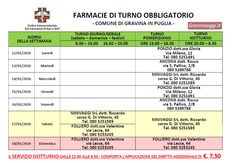 Farmacia di turno a Gravina in Puglia dal 12 gennaio al 18 gennaio