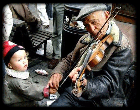 Sua madre lo tirava, ma il ragazzino si fermò a guardare il violinista.