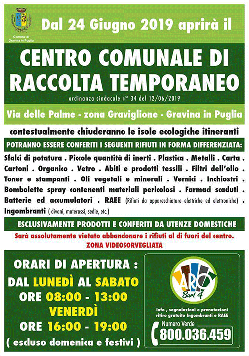 Aprirà i battenti Lunedì 24 Giugno la nuova struttura ubicata in via delle Palme, in contrada Graviglione, destinata a soddisfare le necessità di conferimento in ordine a determinate tipologie di rifiuti. Il centro, che andrà a sostituire le isole ecologiche itineranti sin qui attive (e che Sabato 22 Giugno chiuderanno i battenti), sarà riservato ai residenti in città e sarà attivo (festivi esclusi) dal Lunedì al Sabato, dalle 8 alle 13, ed il Venerdì anche dalle 16 alle 19. Per accedervi occorrerà presentarsi muniti di tessera sanitaria. Sarà vietato l’abbandono in assenza dell’operatore o all’esterno dell’area, dotata di sistema di videosorveglianza per prevenire fenomeni di incuria e vandalismo.
